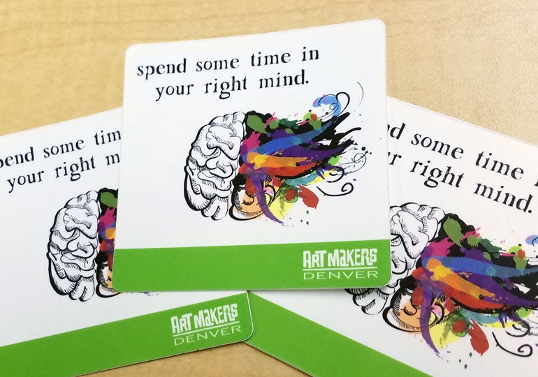 Art Makers Denver 2017 is in its second day here in Denver, and those in attendance will be able to experience the spirit of artistic discovery in a variety of mediums and materials, while exploring a wide range of techniques. The custom sticker they design highlights the hemispheres of the brain, with the right brain radiating with flourish of color representing creativity. For this year, their slogan reads "spend some time in your right mind" as a nod to the design below. As a foundation, there's a green stripe that holds the group's logo.