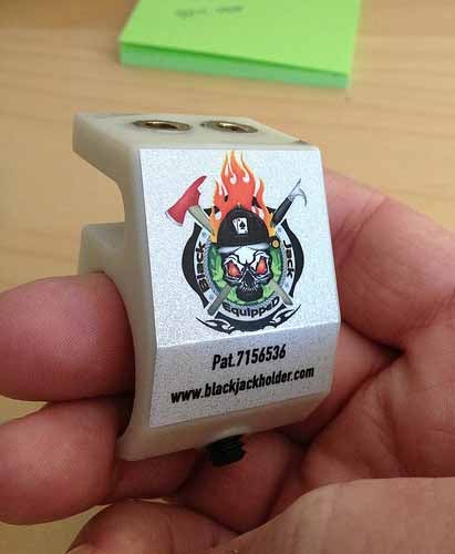 The BlackJack Holder is an aircraft grade aluminum helmet flashlight holder designed by firemen for firemen. The "under brim patented design securely holds the light on the helmet where you put it, where you need it."