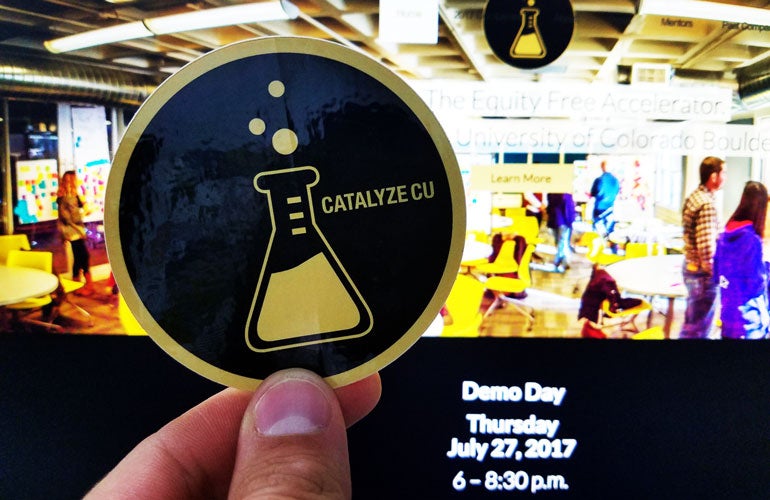 Catalyze CU, the University of Colorado Boulder accelerator, will be celebrating their fourth cohort of participants. They printed up a classic circle sticker of their logo that features the black and gold colors of the CU Buffs and a laboratory theme using a beaker representing the many ideas that bubble up in their accelerator.