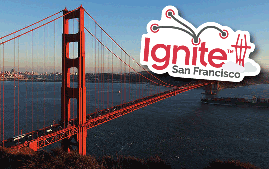 The Ignite Talk challenge to the speaker is to: Enlighten us, but make it quick.Ignite San Francisco is a night of speedy presentations. Presenting on a subject of their choice, speakers have exactly 5 minutes to teach something or simply inspire, but the twist is that the speaker has 20 slides that auto advance every 15 seconds. For Ignite SF 12, organizers are asking the speakers to share part of their world. To show us behind the curtain. You can follow the #IgniteSF action on Twitter.