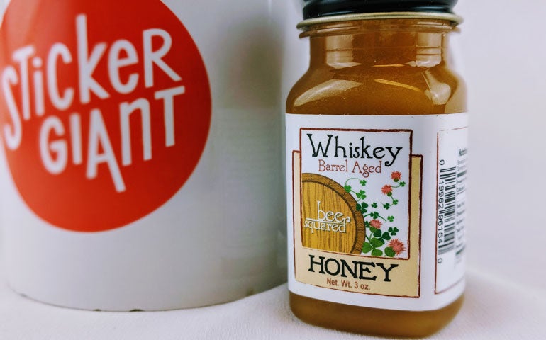 Bee Squared Apiaries is a Colorado honey provider, and they are using our glossy honey labels to help wrap their specialty Whiskey Barrel Aged Honey.