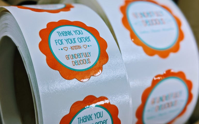 When you're running an online business, you need a presence in the real world, and a simple, bold label with your logo helps give your brand impact long past the purchase. With a personalized message on her Thank You label, Kristin is able to ensure that each Grunderfully Delicious customer remembers the experience and either returns to purchase more or refer other business.