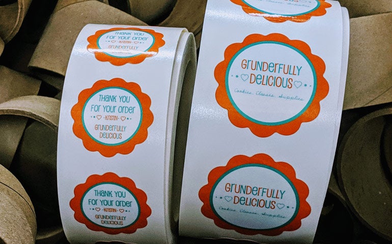 Grunderfully Delicious is a brand started by Kristin Grunder, a homemaker who was looking for a creative outlet. She started documenting her own cookie decorating progress in a blog, which soon attracted thousands of followers interested in the edible art of cookie decorating. And that's how the business was born. Now she's using glossy product labels to help brand her products and get her company out into the world.