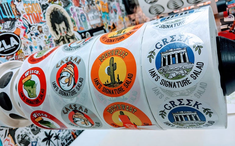 Ian's printed up some fun Valentine's Day holiday themed stickers that we wrote about a few years back, and since then they have continued to innovate in their pizza and in their branded marketing. The focus for this post is that Ian's is using our glossy custom paper labels with four different designs for their different Signature Salads. First there's the Wisco Salad. Then you see the Caesar Salad, the Southwest Salad, and lastly the Greek Salad. There's so much creative art across these four labels, with characterizations and colors that really help make these labels pop off the packaging. Ian's is using these labels for catering orders so that the Ian's Brand is well represented away from their storefront.