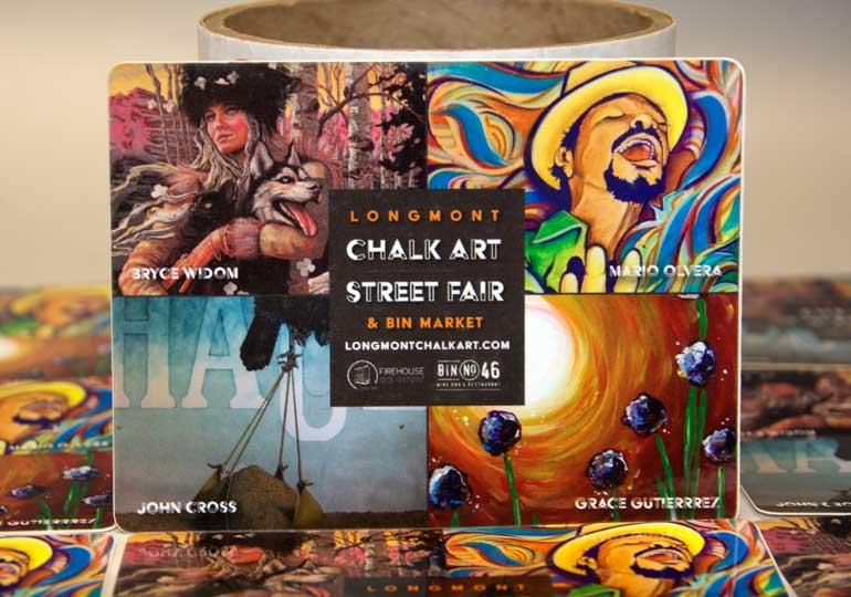 Longmont's inaugural Chalk Art Street Fair & Bin Market on Longs Peak Ave is a free two-day street-painting festival where more than 38 artists will turn the streets of Longmont into a canvas of chalk art. To promote this event around town and give folks who attend something to take home, the organizing team ordered die cut rectangle stickers that feature art from four of the headline artists.