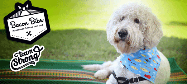 To help raise more awareness, Bacon Bibs has teamed with other dog personalities on Instagram to form Team Strong. Their team logo design was made into awesome custom stickers that are being included in orders of Bacon Bibs during the month of May. Proceeds of sales for the Team Strong products will be going directly to pet cancer research.