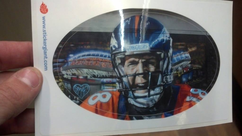 In honor of the upcoming Super Bowl, Longmont, Colorado-based StickerGiant and Gamma Gallery have joined forces with local street artist extraordinaire Gamma Acosta, to produce a limited edition sticker. The sticker artwork represents a Longmont mural that Gamma created of Peyton Manning commemorating the Broncos last year.