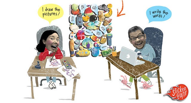 As all of us in writing know, sometimes you hit a wall. Matthew and Robbi decided when they hit a wall to create a book where the reader decides the story. They created a Make-Your-Own Book with a sticker sheet and fill in the blank approach to story telling. The sticker sheet has bubble sayings, different things and items, all custom shaped, to help you piece together your own story with stickers! How awesome is that?