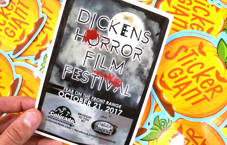 Events at the Dickens Horror Film Festival celebrate the entire process of film making; from the exchange of ideas with other determined filmmakers, engaging in the craft of film making and giving recognition to the unique visions of other artists thru the awards. Join us in celebrating that hard-fought journey to create a film.Colorado Festival Productions want their audience to connect with the artists, the musicians and the filmmakers that have made Longmont and The Front Range their home. Their hope is that you’ll discover a film that warms your heart, touches your soul, or just makes you think. Stickers make for the perfect parting gift when patrons leave any type of festival, so make sure that as the credits roll you're ready with your own custom stickers. It's an instant way to connect with an audience and then have them take your brand on their own journey.