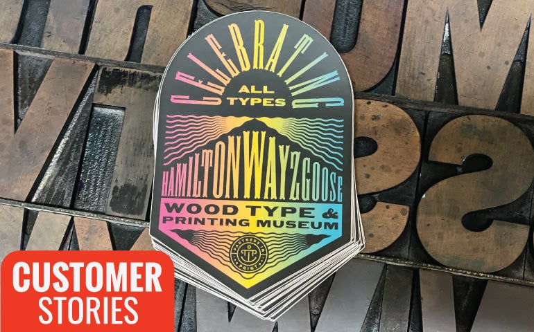 "We needed something to send with orders from our store and thank you notes to donors," says Jenny Wilkson, a member of the Partners in Print leadership team. "We needed something that had our new logo, something we could bring to events as a giveaway that had our mission. StickerGiant was really wonderful and one of the perks of going nonprofit is that suddenly we're qualifying for really meaningful gifts and partnerships." They use the clear sticker sheet you see at the top of the page as a piece of promotional branding, and there are ten different peel offs that have symbols from the letterpress process, whether it's the Brayer roller, the star or the manicule. The paper labels are used to seal up swag bags and other packaging that gets sent out to people. Jenny designed all of these stickers and labels, and she set up the files with intention to represent the Partners in Print, while also maximizing the use of the product mix. "The paper labels we use on everything. I'll slap them on a package, and the box feels more custom. I was able to get them to alternate colors, which is pretty awesome," she says. "These are so versatile because I designed them to be name tags, so we can put it on our shirt with a sharpie. We label boxes with it, so we put it on all our packaging." Once recent project where die cut stickers came in handy was an event with the Hamilton Wood Type & Printing Museum in Two Rivers, Wisconsin."The Hamilton Museum is an amazing place, and they have a wonderful community," says Jenny. "The Hamilton Wayzgoose is an annual event where there is always swapping of prints from the people who came. Now it's virtual, and we worked with them to send stickers out to all of the printers who participated and to give to volunteers, so it's been a really nice collaboration and people from all over."