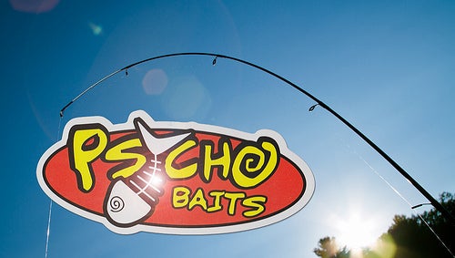 Psycho Baits' new oval stickers hooks 'em up with a custom die cut that gets their logo leaping out of the water. You know we love 'em big and bold, and the Psycho logo fits the bill with bright primary colors. Hypnotizing yellow type with a scratchy black outline blasts over the red oval background. The big white Y bait icon is why this one really stands out, with the head and tail poking off off the red oval. A nice thick white outline surrounds the entire sticker to get it bouncing off the paint on your tailgate.