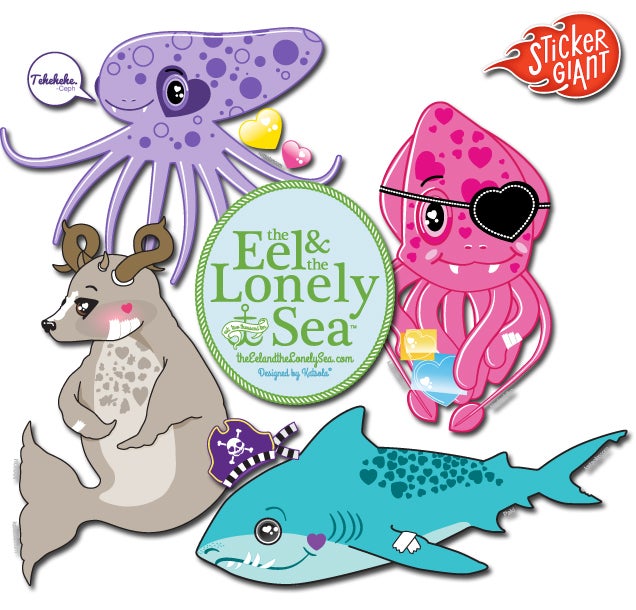 "The Sirens are: Morwenna, the pibgorn playing, starfish eye patched, white locked Arctic siren and her Narwhal Yseult; Oki, the Japanese Koto playing, raven haired siren and her heart shaped eye patch wearing squid, Nadeshiko; Cordelia, the red haired, mandolin playing Welsh siren and her muse the bindi wearing seal, Ronan and Kailani, the chestnut tressed, Ukeke playing Hawaiian siren and her muse, Alapai, the swim goggle wearing Eel, who also wears the sailor hat of a previous 'suitor'."These beautifully illustrated characters are available as full color premium white vinyl stickers through katsola's online store. Some of her other work is on display at the East End Studio Gallery in Houston, Texas. Whether you are creating a work art or just dabbling with a design, nothing beats our kiss cut stickers to really bring out artistic creations in stickers.
