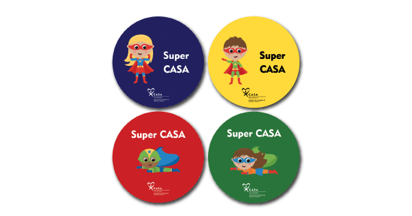 To celebrate and promote awareness of their team, they designed promotional stickers that feature the volunteers as super heroes in four different designs. Each custom circle sticker has a different CASA hero with different color combinations stating "Super CASA" and their company details below.