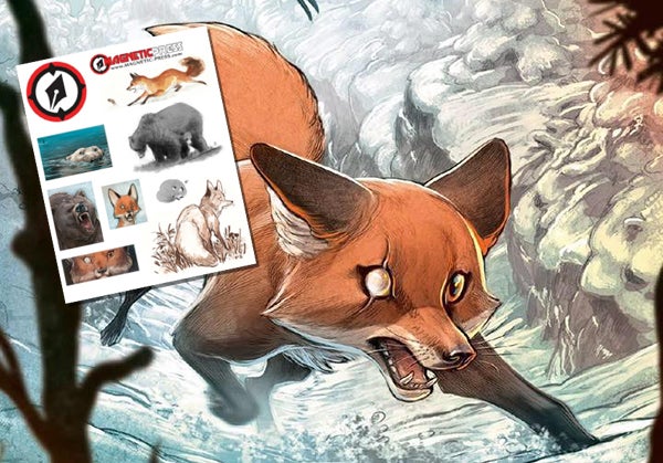 In addition to the beautiful publication and design of the book, they took a series of images from the story and created a full page custom sticker sheet with each visual having it's own custom shaped, peel off sticker. They are available for sale through Magnetic Press and are a great sticky showcase of the design and story behind Love: The Fox.