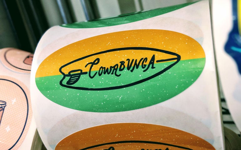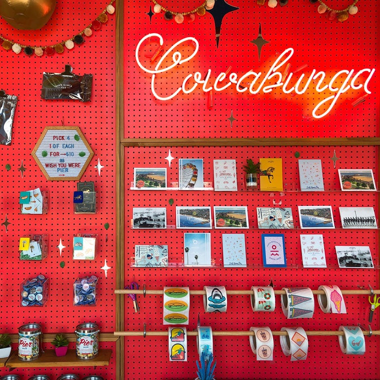 These kiss cut stickers on a roll are for this season's relaunch of the shop. The team at the Pier decided to include four items in their gift shop: pins, buttons, stickers and postcards. Visitors to the Pier gift shop can choose one of each item on the wall, and then place them in or on a Santa Monica Pier branded pouch to represent their visit to the Pier. It's quite a placement for these stickers, and they are sure to please locals and tourists alike. This bright-pink peg wall with a neon light that says "COWABUNGA" above invites in visitors to pick their favorites and leave with a memorable souvenir.