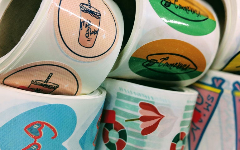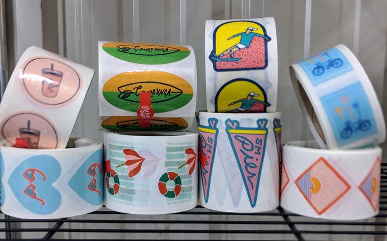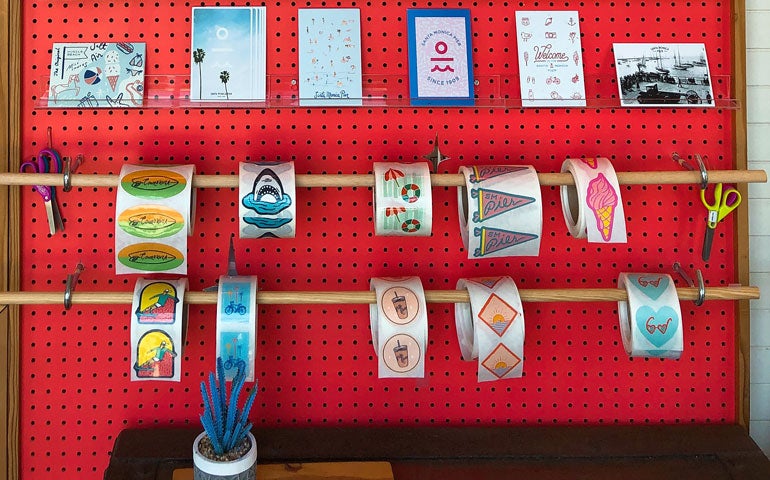 California's iconic Santa Monica Pier has been serving beachgoers for over a hundred years, and this sticker craft station is part of the Pier Gift Shop, where thousands of visitors buy apparel and branded gear.