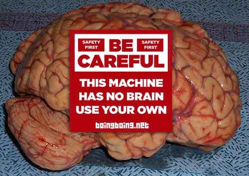 Today's sticker is like a little public service announcement from the fine folks at boingboing.net. "BE CAREFUL," it advises. "This machine has no brain. Use your own." I can see this plastered everywhere: on cars, on punch presses, on ATMs, on the drink fountains at fast-food restaurants, on refrigerators, on gas pumps, on Internet kiosks, and, most of all, on my underwear. Although it's a very convincing sticker, at least to me, I'm pretty sure it won't pass OSHA standards, so if you do have a punch press, you might want to opt for something a little more official.