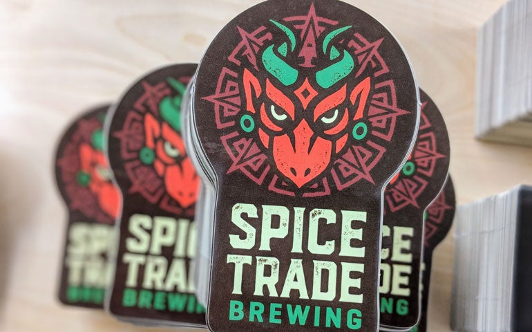 Spice Trading Brewing in Arvada, Colorado, has a keyhole-shaped, custom glossy die cut sticker that they've adorned with a truly bold use of color and their iconic brand. The craft beer world is very competitive, and you have to stand out with an eye-catching design, which Spice Trade certainly has with an aesthetic based on culinary ingredients and traditions from around the world.