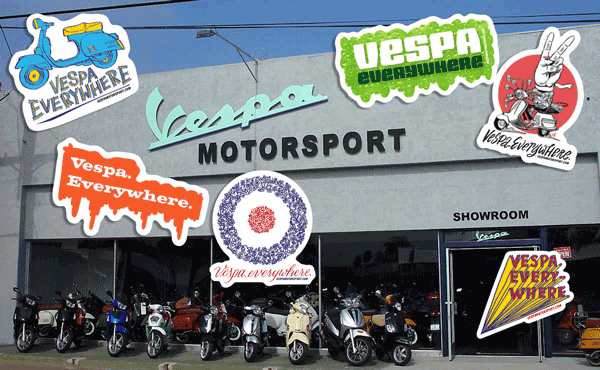 Vespa Motorsport is creating buzz with stickers as their vespa stock flies out the door. They are honoring 24 years of business with a killer party and the launch of an ad campaign titled: Vespa. Everywhere.