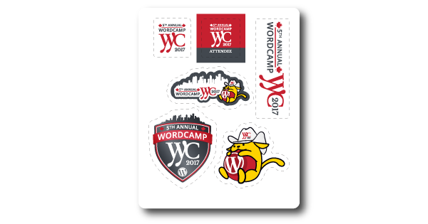 In Calgary at WordCamp YYC, we have cowpoke Wapuu giving a nod to the Calgary Stampede, a massive July rodeo and festival that has put "Cowtown" on the map. There are a few badges and city mashups on the sheet, with a total of six stickers that really bring out the event branding. This is the 5th annual WordCamp Calgary, and we are excited to celebrate with these stickers. And happy 150th birthday Canada!