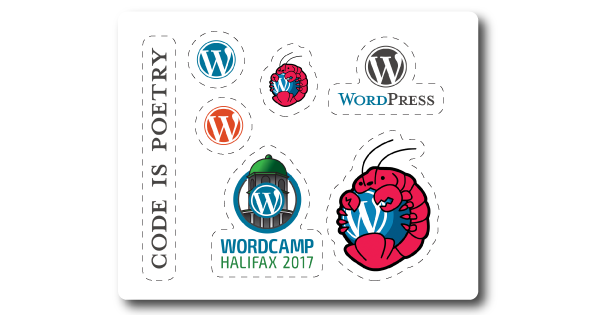 Now heading east to WordCamp Halifax, we have a completely reimagined Wapuu taking on the costume of Lobster Wapuu. This is a great take on our cuddly friend, and he's surrounded by a host of WordPress logos, and a mini version of himself. Two Wapuus on one sheet, nice! Then of course they have the unofficial motto of the WordPress community: Code Is Poetry. Indeed, a well-written piece of code is truly a lyrical thing, and we know that everyone who leaves a WordCamp takes with them at least a stanza or two or true poetry within web development. We loved following along on their blog as they unveiled their design--it made for a cool rollout and helped build the excitement.