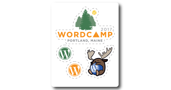 Ending back in the United States, we're grooving on Moose Wapuu at WordCamp Portland, Maine. Plus there are some lovely conifers and a shining sun on the event sticker, and a couple WordPress logos in the yellow and green swatch that their design team picked. Year after year this team brings fresh graphics to our printers, and we love to see where they let their imagination take them.