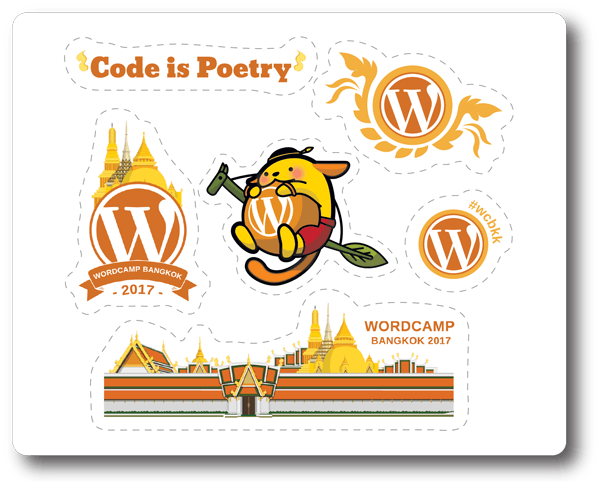 WordCamp Bangkok has a classic sticker sheet with a Wapuu on it as the main element. There are also peel-offs for Bangkok's historic Grand Temple temple (or Wat in local parlance), WordPress logos and the Code is Poetry slogan that defines all WordCamps. Wapuu is wearing traditional Thai clothing and he's carrying a banana stalk. Bananas have a special role in Thai culture, with the leaves and stalks used in ceremonial activities and everyday life.