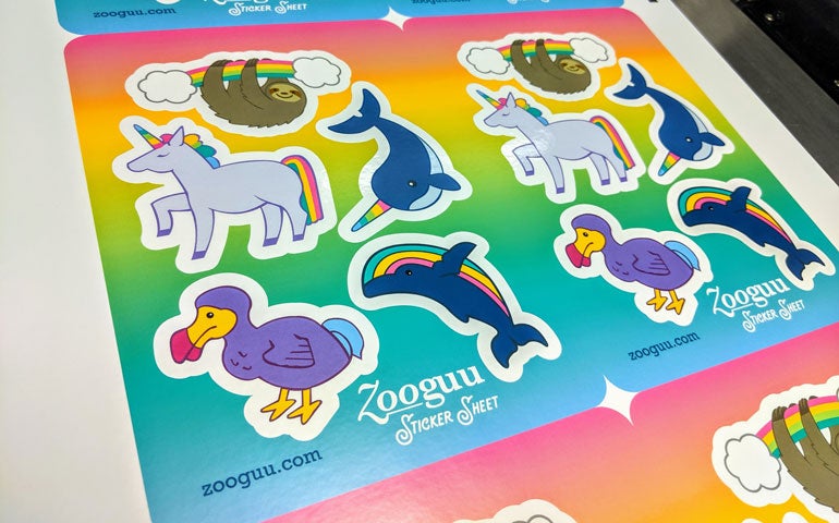 What is faux taxidermy, you might ask? (We certainly did.) Well, it's what you'd imagine: stuffed animals, but mounted like you might see a hunting trophy. But these are no ordinary wall decorations. These are far-out creatures, some real and some mythic, and all totally rad. You can see in the sticker sheet that there's a rainbow-horned narwhal, a sloth hanging on a rainbow (check out the actual stuffed sloth pic below!), a unicorn (because unicorns are really, really having a moment right now) and dodo bird and a rainbow-backed whale. And as they like to say at Zooguu, "rest assured, no actual (or stuffed!) animals were harmed in the making!"
